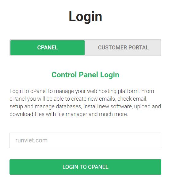 - Một là vào thẳng Cpanel để quản lý hosting của bạn bao gồm cài đặt tên miền, wordpress…Bạn đăng nhập bằng tên miền và tài khoản mà Stablehost gửi vào Email của bạn