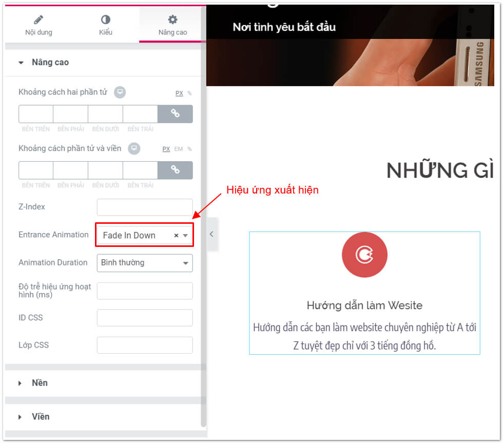 Ở mục nâng cao, các bạn chỉ quan tâm tới phần hiệu ứng thôi nhé. Có khá nhiều hiệu ứng để bạn chọn giống như trình diễn Powerpoint.