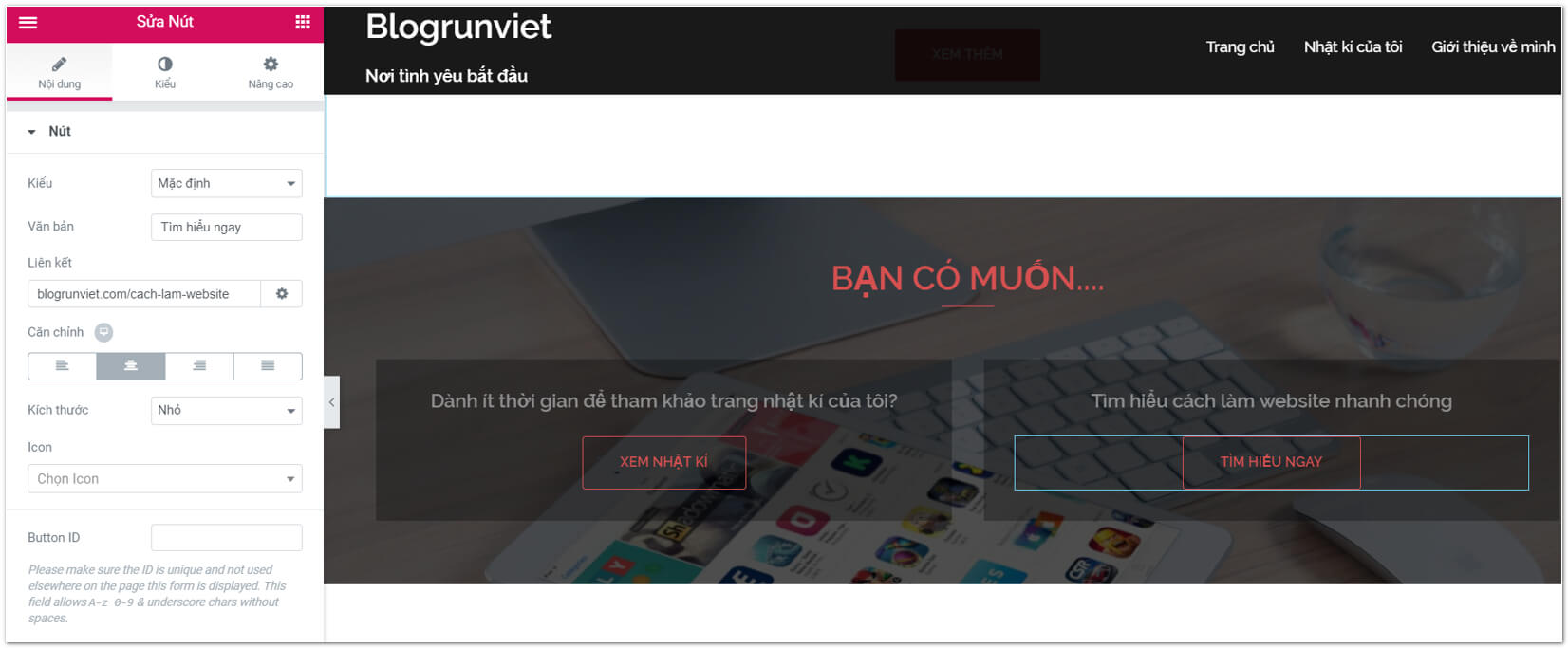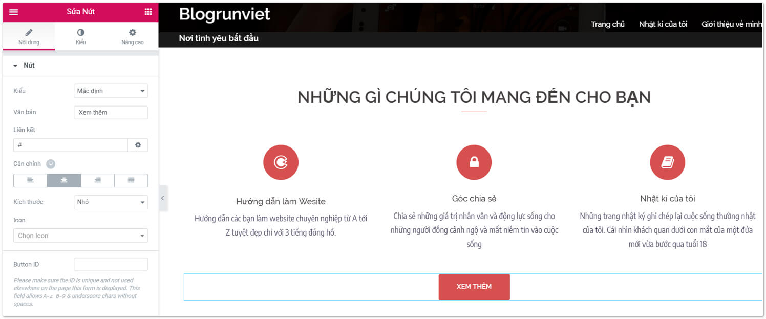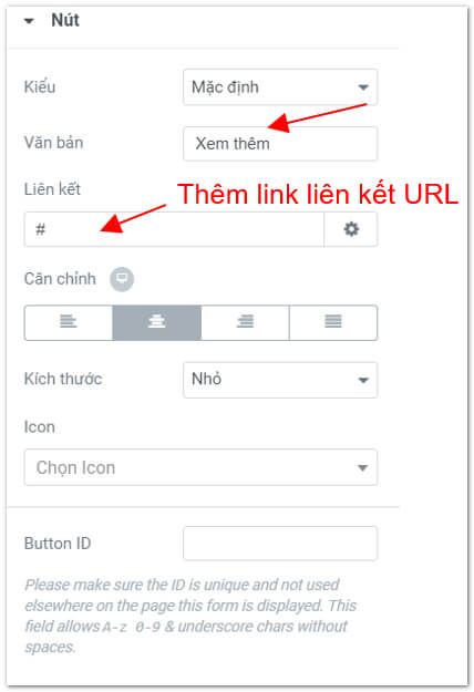 Trong mục nút sẽ có mục Liên kết URL đang để là #. Để tạo hiệu ứng bấm vào nút xem thêm sẽ tới bài viết của bạn. Hãy copy đường link bài viết để vào đây. Ví dụ như: tenmiencuaban.com/nhat-ky