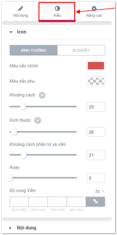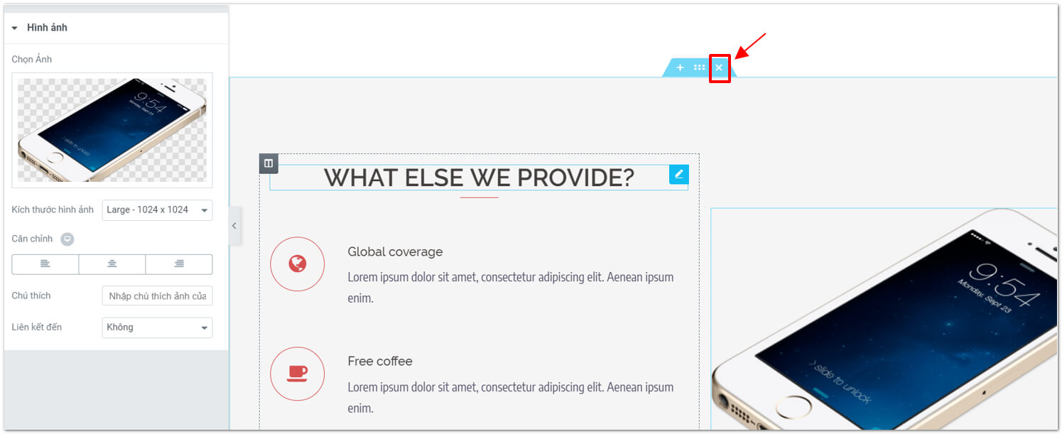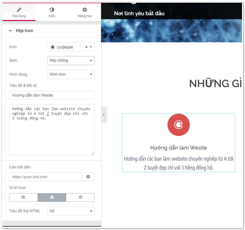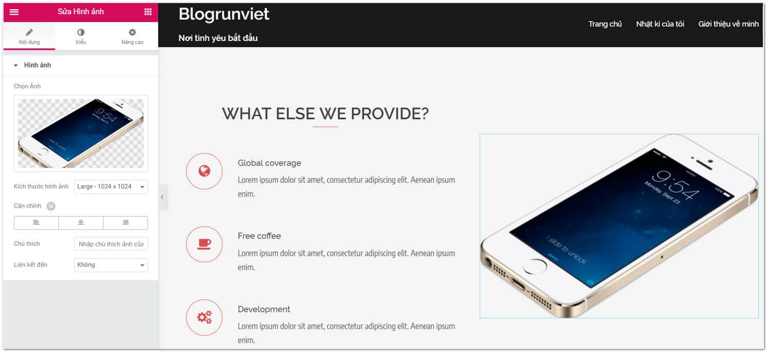 Cột bên trái là công cụ Elementor. Bạn kéo xuống để sửa từng mục như mình nhé
