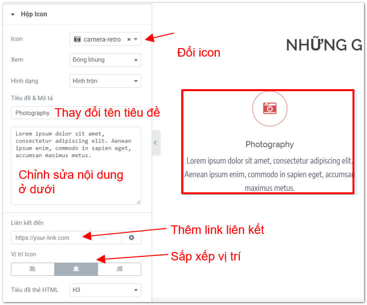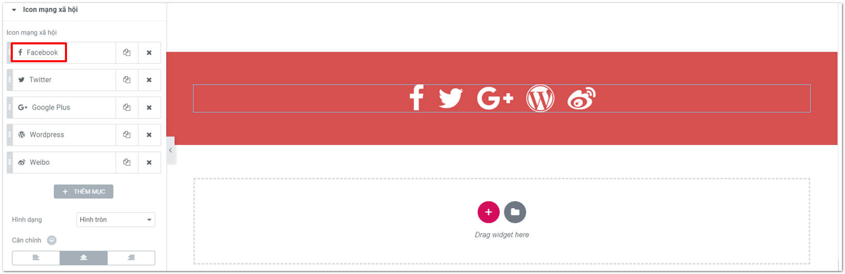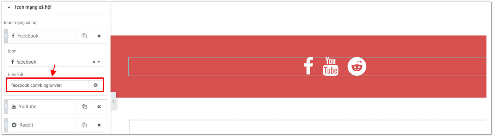 Icon mạng xã hội: bạn muốn kết nối tới trang facebook của bạn thì nhấp vào facebook và thêm địa chỉ facebook của bạn vào. Cái nào thiếu thì bạn thêm và đổi icon. Không cần thì xóa nó đi