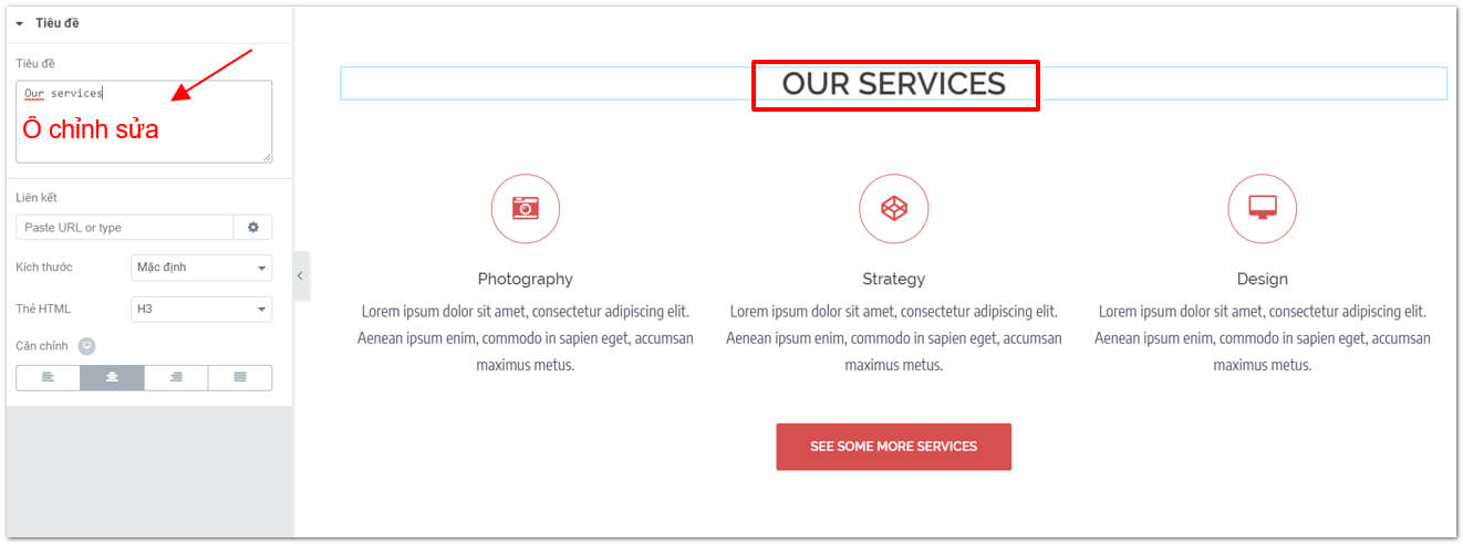 Để chính sửa thì cực kì đơn giản, bạn nhấp vào chữ Our Services sẽ hiện ô chỉnh sửa ở cột bên cạnh. Bạn chỉnh sửa trực tiếp hoặc thay đổi ở đó. (Bạn nhớ vừa đọc vừa thực hành sẽ dễ hiểu hơn)