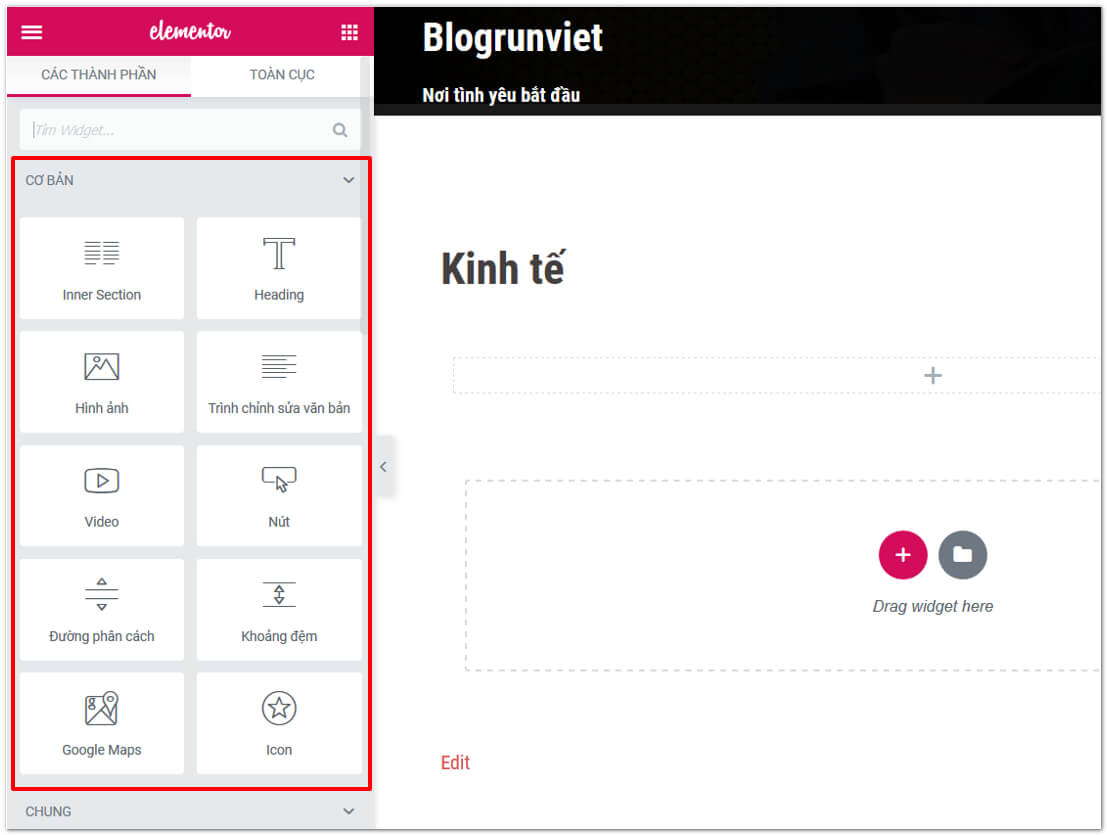 Bạn sẽ có giao diện chỉnh sửa tương tự như trang chủ.