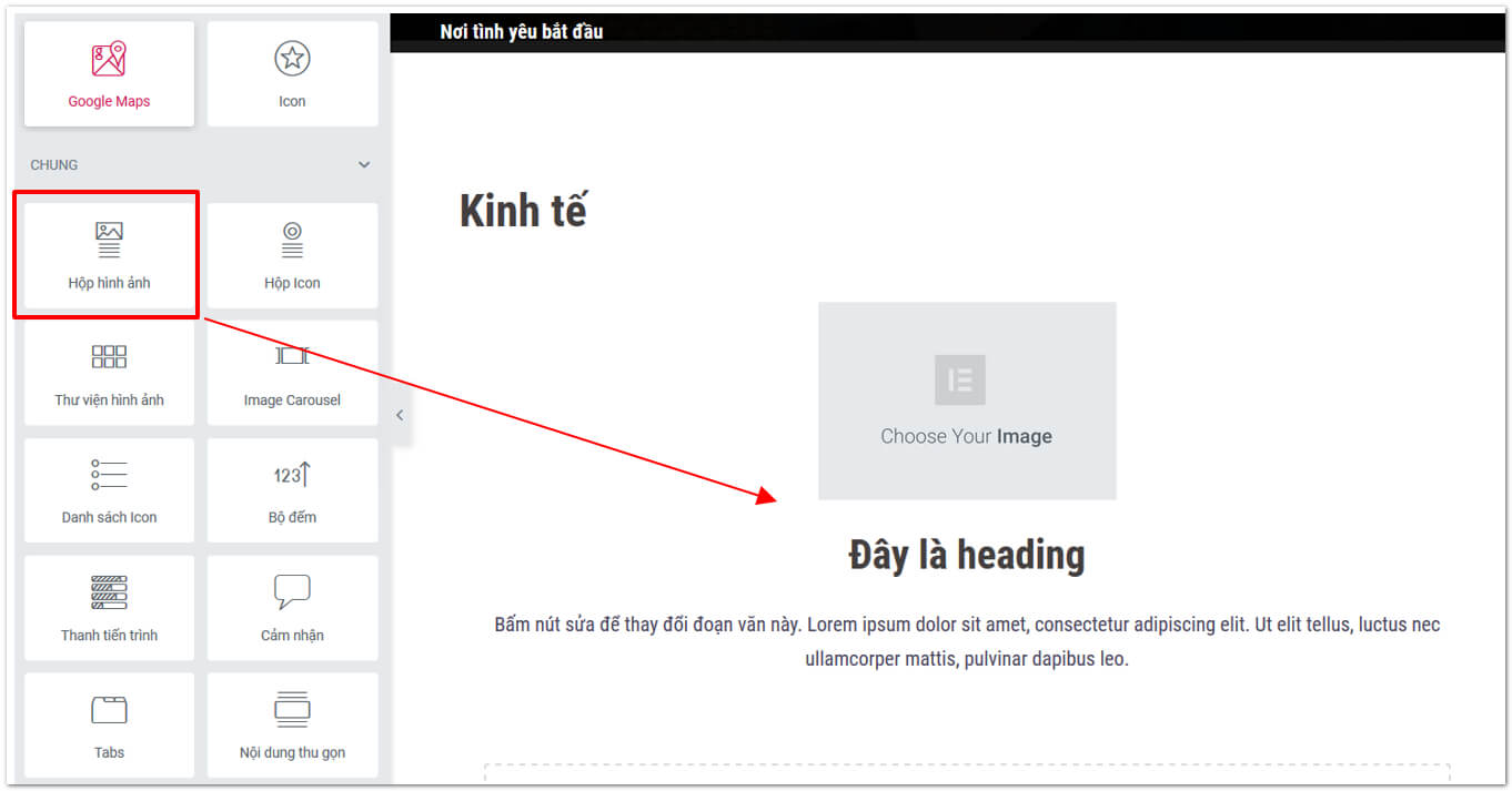Chọn 2 cột: 1 bên là hình ảnh, 1 bên bạn chọn Heading và thêm Trình chỉnh sửa văn bản