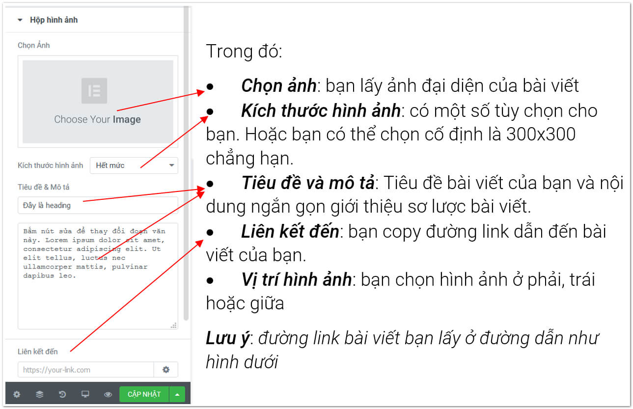 Tạo 2 bài viết ở 2 cột bằng cách chọn hình ảnh phía trên và thêm Heading phía dưới. Bỏ phần giới thiệu. Nhớ chọn kích thước giống nhau để hình ảnh xuất hiện đều nhé các bạn. Vi dụ: 400×300