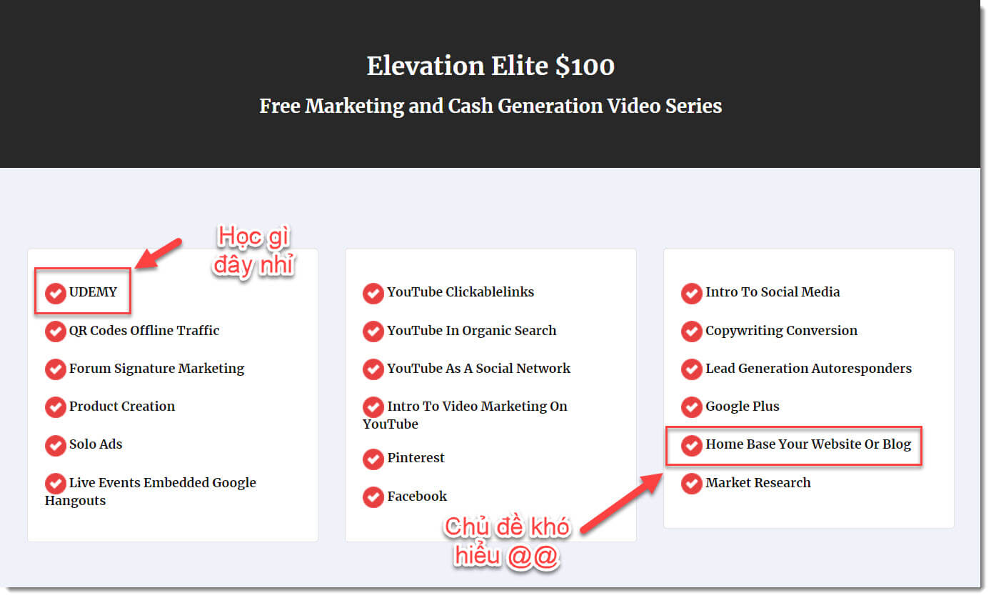 Đây là các khóa học mà tôi cho rằng nhiều cái khá vô duyên, thậm chi chẳng cần thiết học để làm gì. Mặc dù bạn sẽ được học về liên kết tiếp thị và các marketing qua mạng xã hội nhưng có một số chủ đề khá khó hiểu