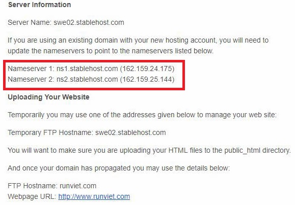 Thông thường, để lấy địa chỉ DNS của hosting, bạn sẽ lấy thông tin được gửi về email của bạn. Ví dụ với StableHost:
