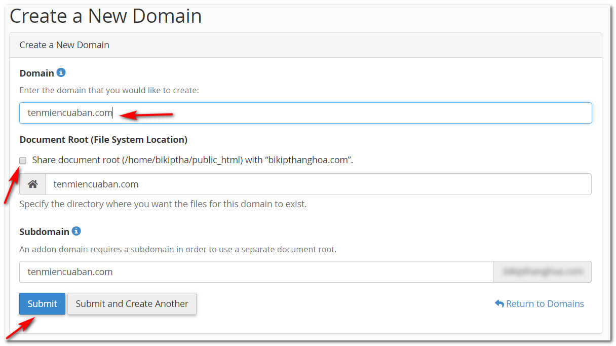Nếu tên miền bạn cần cài đặt khác với tên miền chính bạn đăng ký ở trong Hosting. Thì bạn cần đăng ký ở trong cPanel hosting.